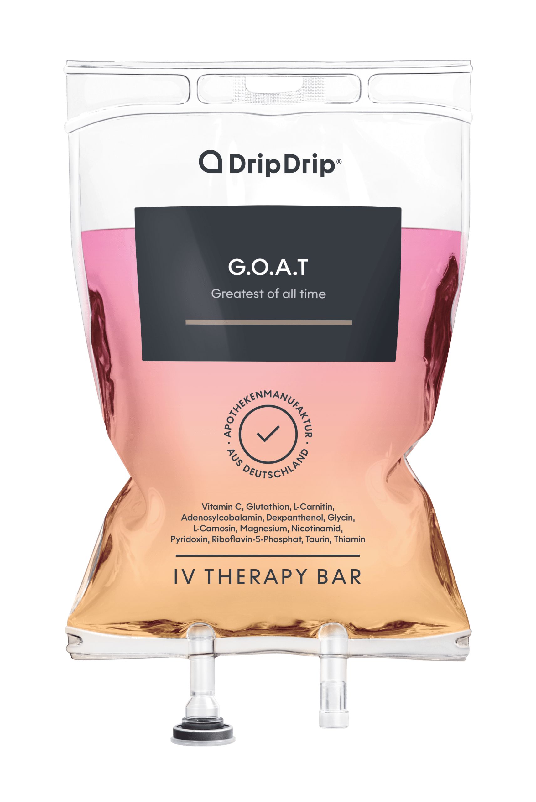 The G.O.A.T. Drip—Greatest of All Time—is the ultimate power infusion for anyone who regularly pushes their limits and strives for peak performance. This potent combination of 7.5 g vitamin C, 1200 mg glutathione, and an intensive ATP-based amino acid and B12 complex is designed to help boost energy levels, enhance mental clarity, and improve endurance sustainably.
